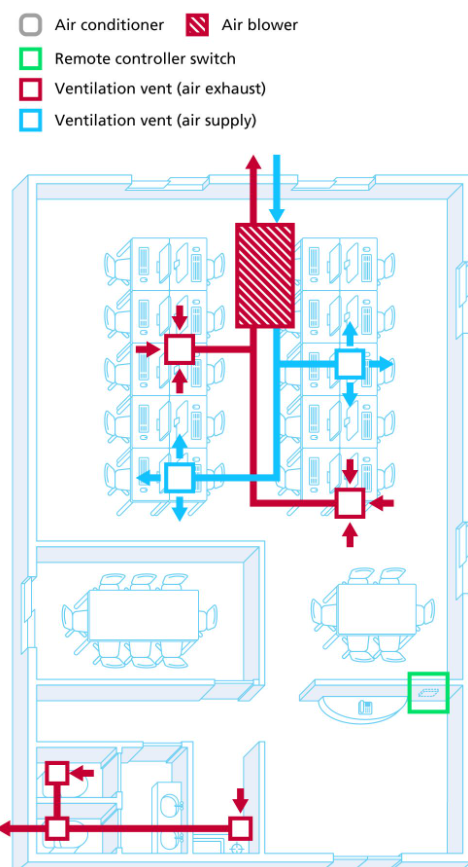 Hệ thống thông gió giúp đưa không khí tươi từ bên ngoài vào và loại bỏ không khí cũ, đảm bảo nồng độ oxy và chất lượng không khí trong văn phòng. Đây là yếu tố đặc biệt quan trọng với các không gian kín và mật độ nhân sự cao.