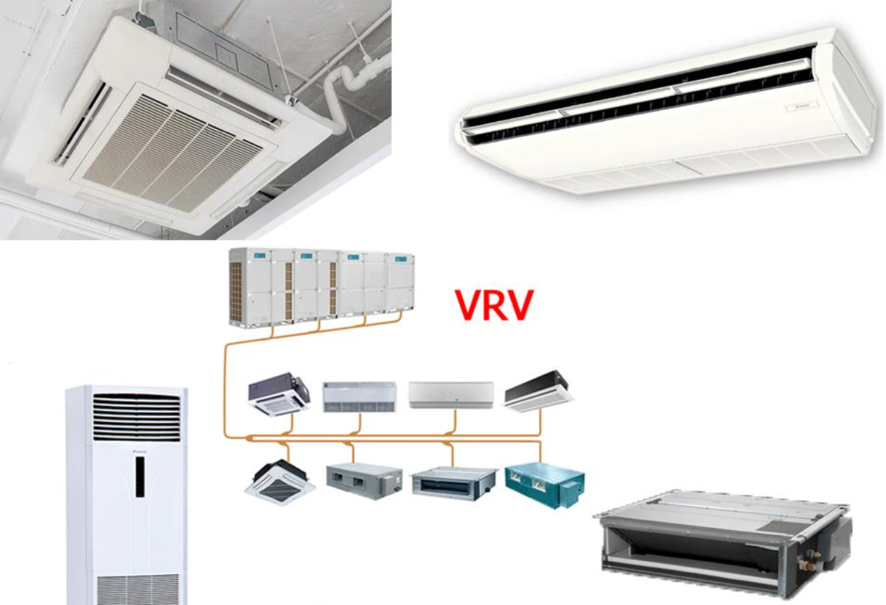 VRV (Variable Refrigerant Volume) hoặc VRF (Variable Refrigerant Flow) là hệ thống điều hòa biến tần, phổ biến tại các tòa nhà hạng B và văn phòng linh hoạt.