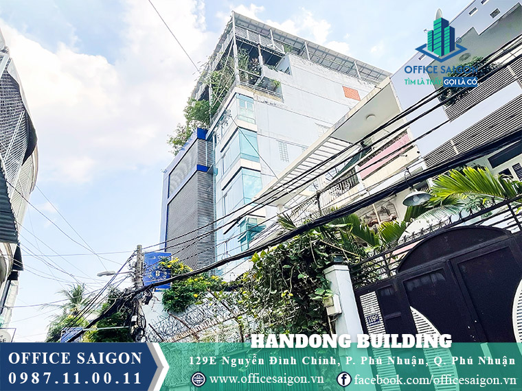Tòa nhà cho thuê văn phòng Handong Building nằm tại mặt tiền đắc địa số 129E Nguyễn Đình Chính, Phường Phú Nhuận, TP.HCM. Điểm nổi bật của tòa nhà là lối thiết kế tân cổ điển với thiết kế là bề mặt kính bên ngoài hai bên là tường trắng tạo được không gian riêng tư cho văn phòng, mặt kính bên ngoài giúp cách nhiệt, cách âm, tận dụng được nhiều ánh sáng tự nhiên làm cho không gian văn phòng sáng sủa và thông thoáng hơn.
